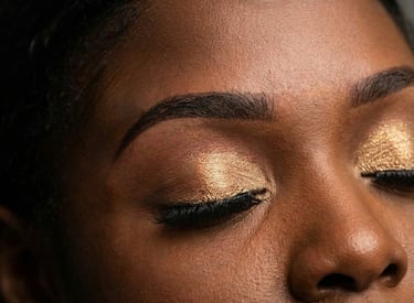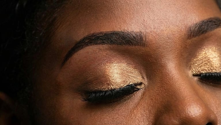 Close-up of perfectly sculpted, shimmering ombré brows under soft, glowing light.